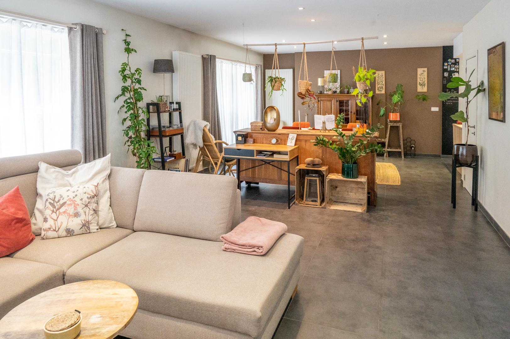 Via de zijdelingse ingang met toilet en berging kom je in de lichtrijke ruime living (48 m²) met open volledig geïnstalleerde keuken (18 m²). Verder ga je via een glazen deur in het aanpalende bureau, de ideale thuiswerkplek !
