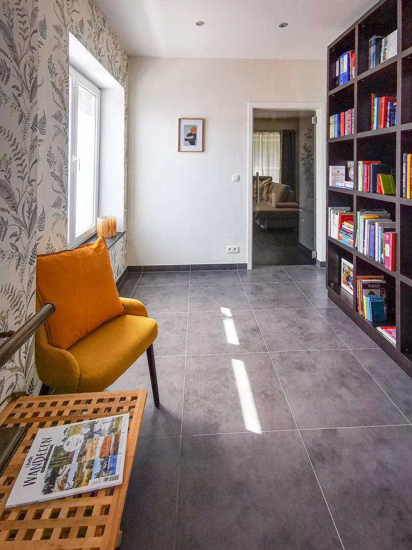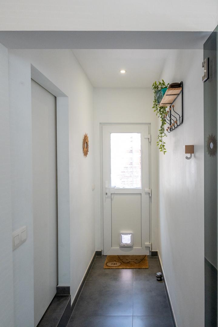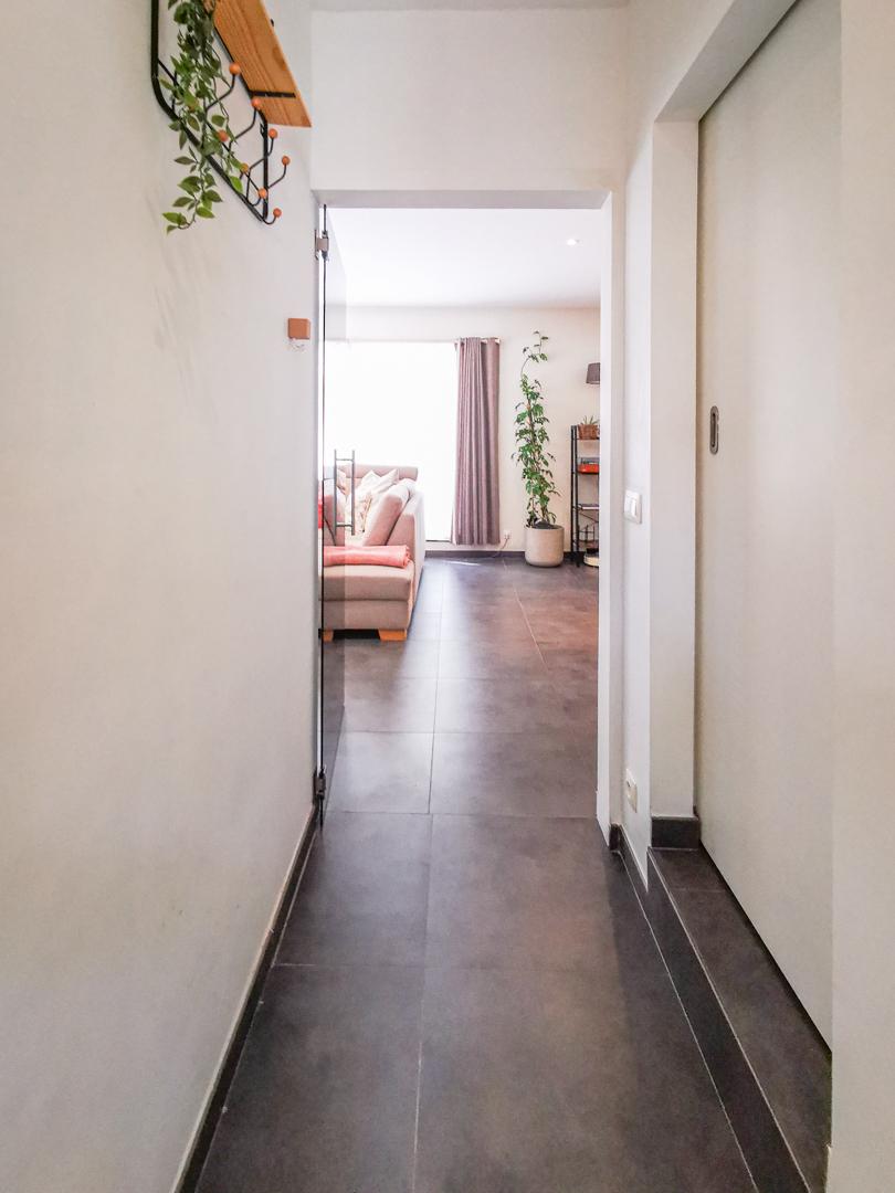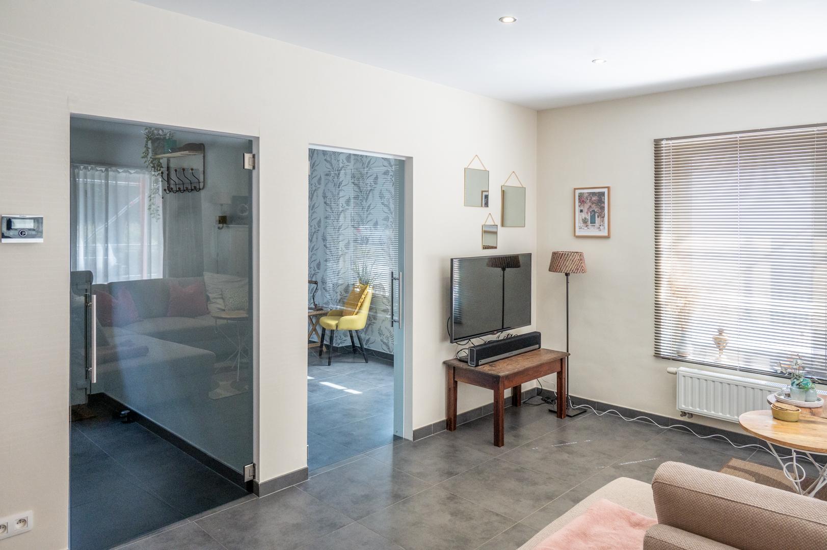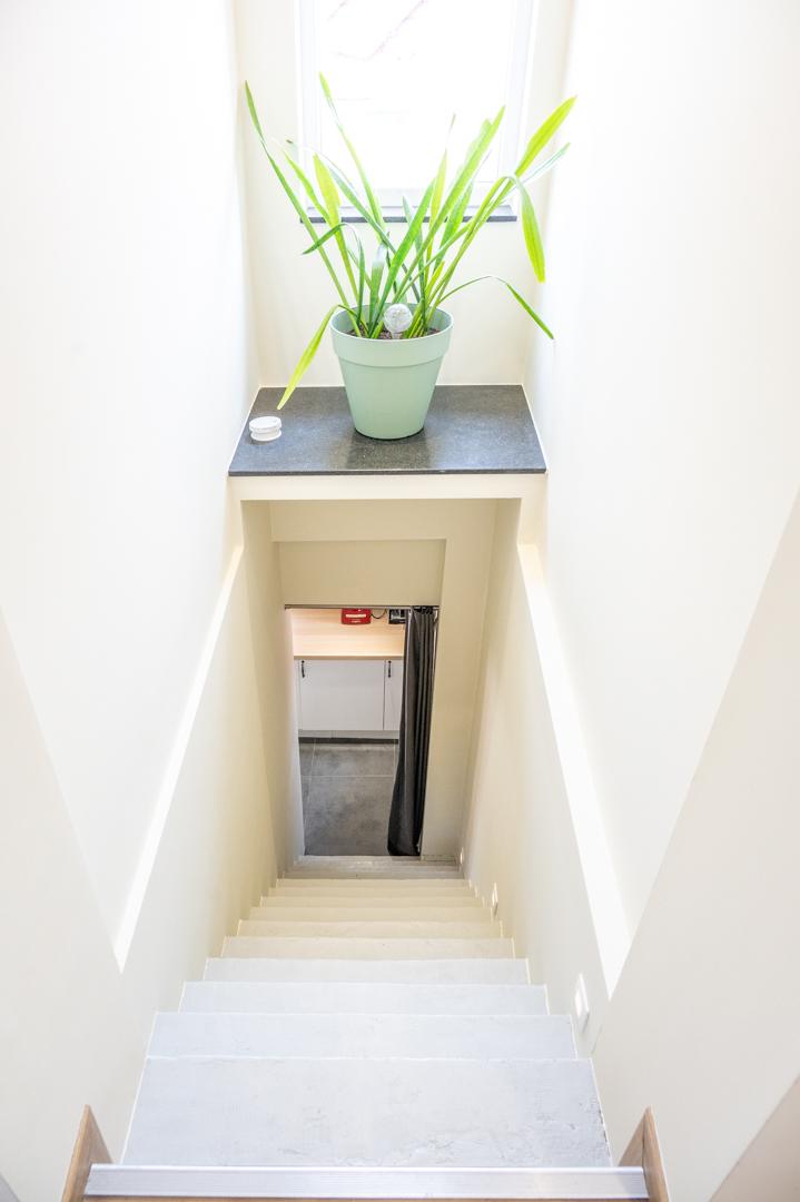 Via de zijdelingse ingang met toilet en berging kom je in de lichtrijke ruime living (48 m²) met open volledig geïnstalleerde keuken (18 m²). Verder ga je via een glazen deur in het aanpalende bureau, de ideale thuiswerkplek !