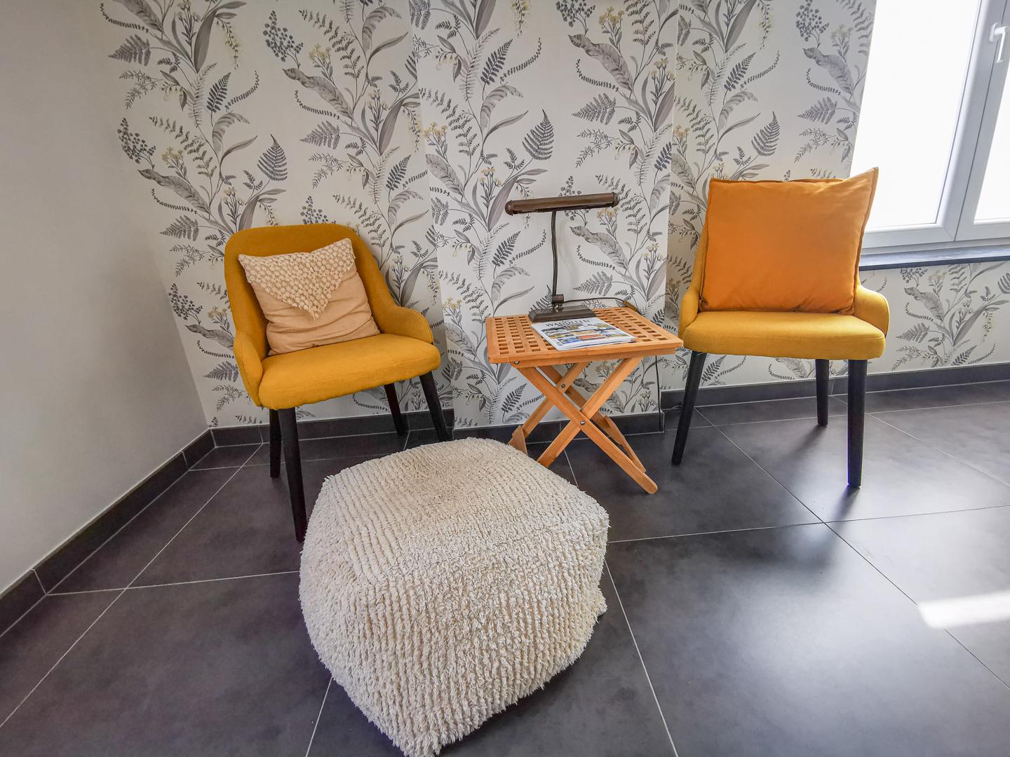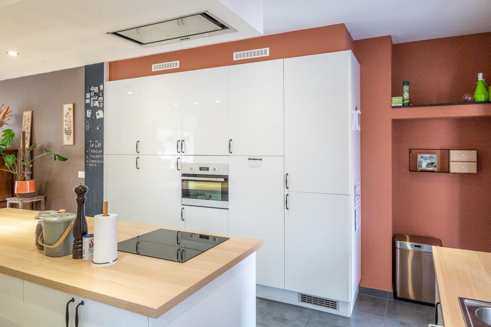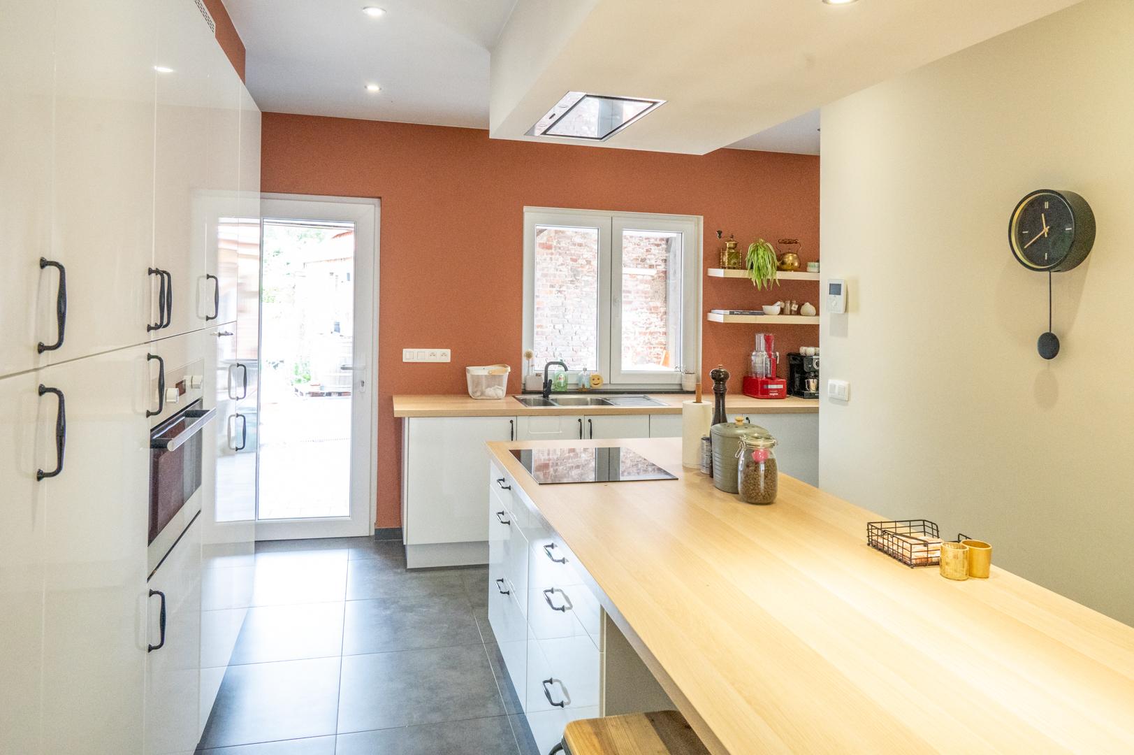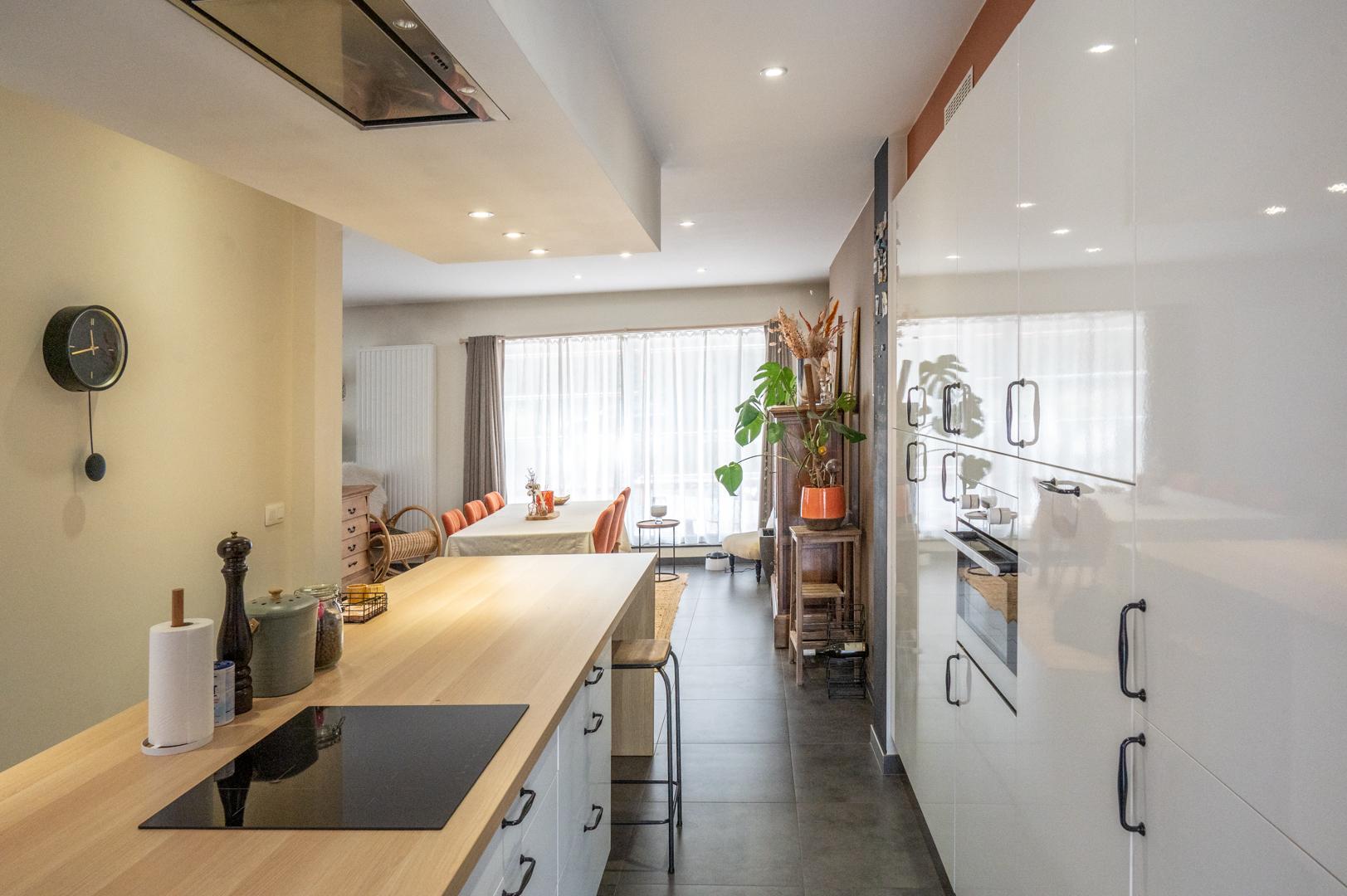 Via de zijdelingse ingang met toilet en berging kom je in de lichtrijke ruime living (48 m²) met open volledig geïnstalleerde keuken (18 m²). Verder ga je via een glazen deur in het aanpalende bureau, de ideale thuiswerkplek !
