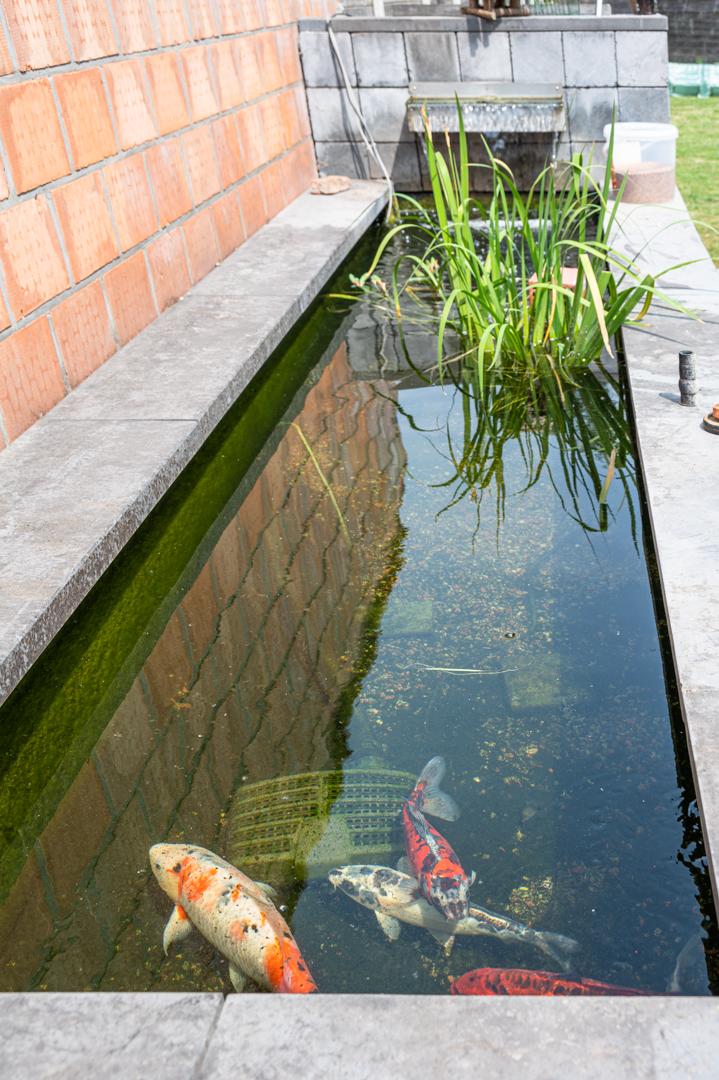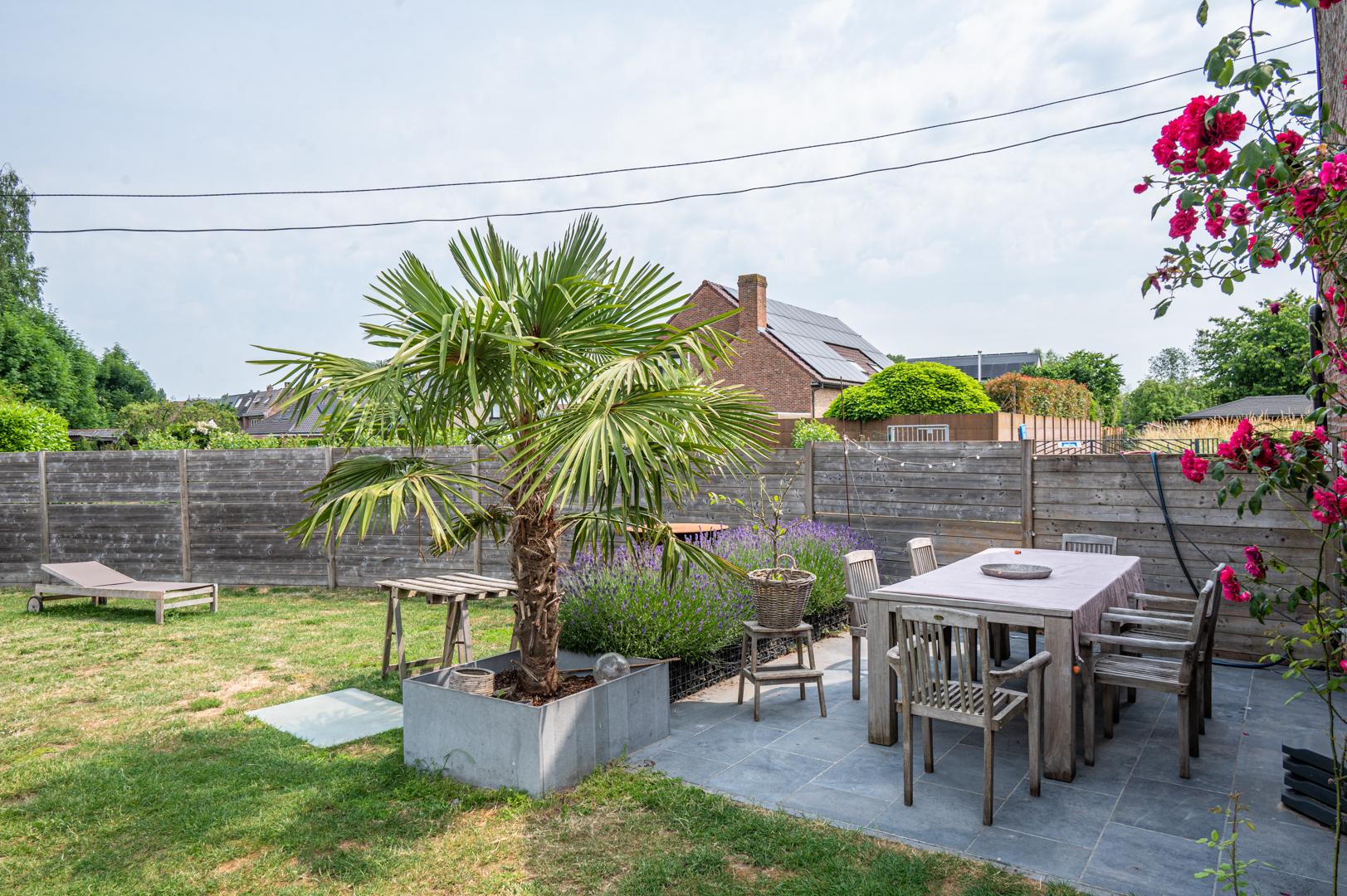 De tuin is een oase van rust met een overdekt terras , een siervijver, gazon en een tweede zonneterras.