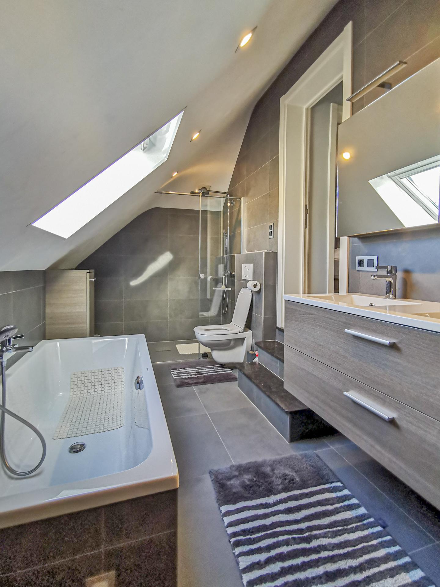 Verder heb je boven 3 slaapkamers en een nieuwe badkamer met inloopdouche, bad, toilet en dubbele lavabo. De zolder dient als extra bergruimte. Overal zijn ook rolluiken voorzien.