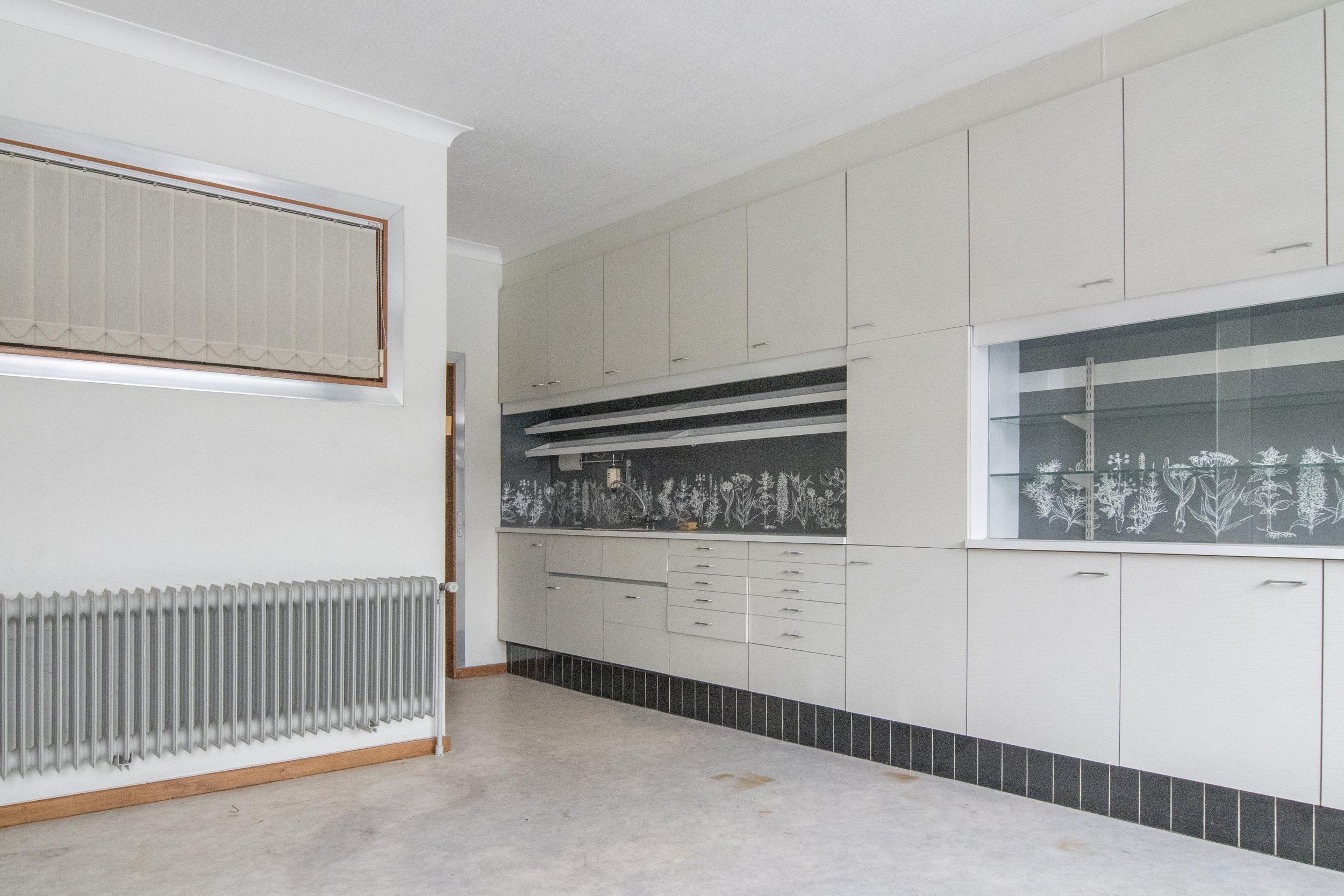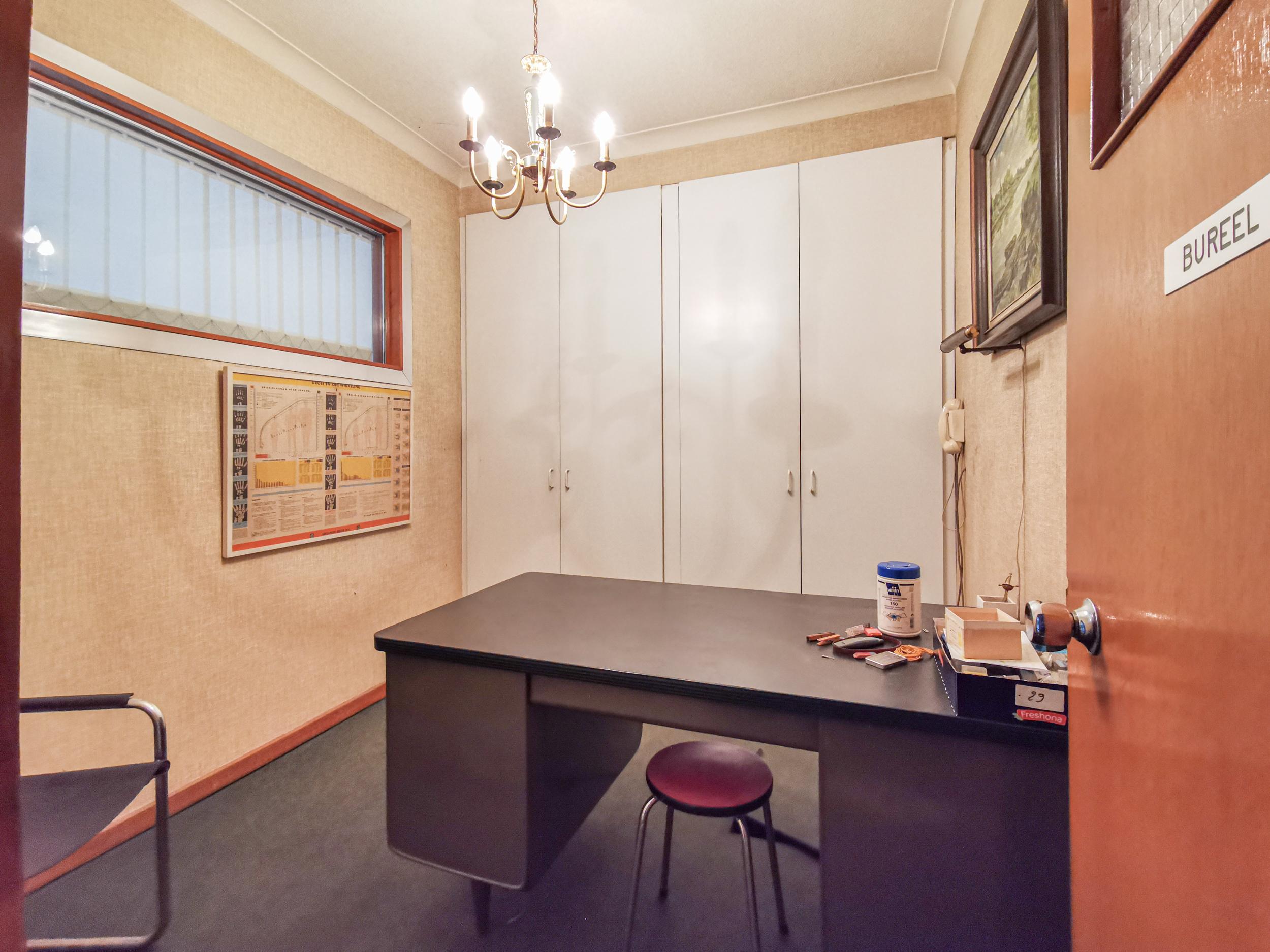 Op het gelijkvloers kom je via de inkomhal in de voormalige praktijkruimte met 2 kabinetten, wachtzaal en bureau. De lift brengt je op het eerste verdiep waar het woongedeelte een zee van ruimte biedt: keuken, bijkeuken, veranda en lichtrijke living met parket. De bar en open haard maken het geheel compleet.